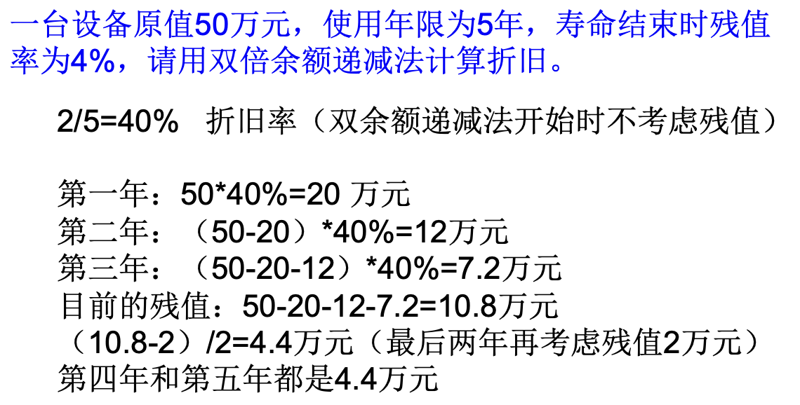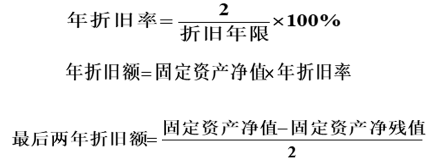 逐年计算,年折旧率不变,年折旧额递减,最后两年减去残值后均分剩余折旧额