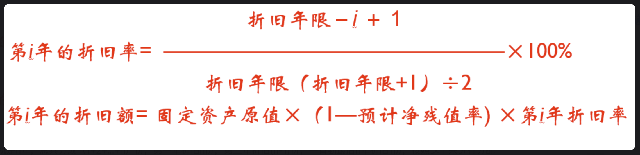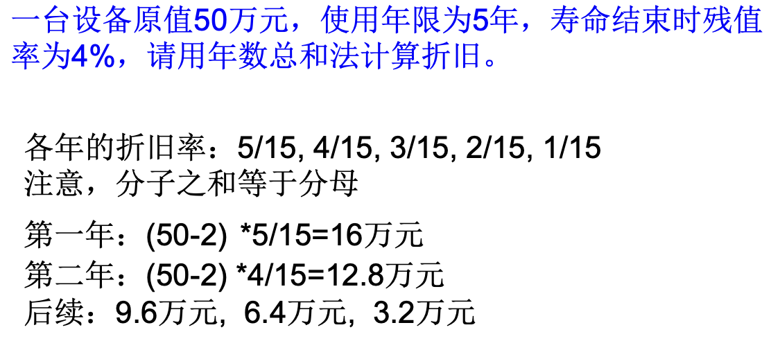 先计算出每年折旧率(当前年数在总年限中的占比),再拿总折旧额(即已减去残值)乘以折旧率的年折旧额