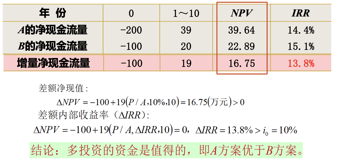 - 寿命期相等:差额净现值、差额内部收益率、差额投资回收期(静态)