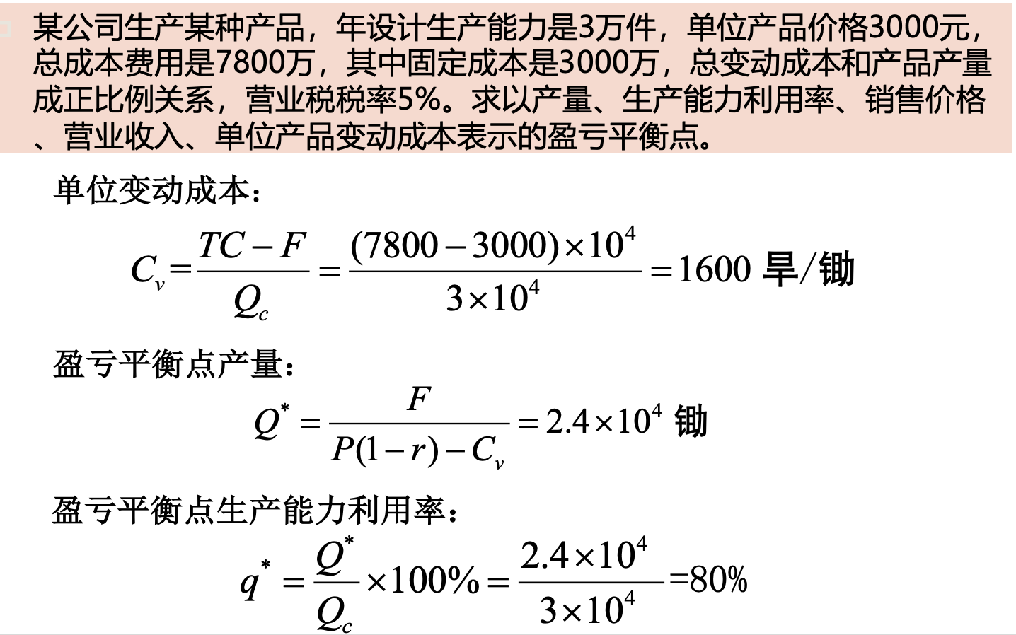 盈亏平衡点 = 固定成本 / ( 产品价格*( 1 - 营业税税率 ) - 变动成本 ) ,即 销售额刚好cover固定成本